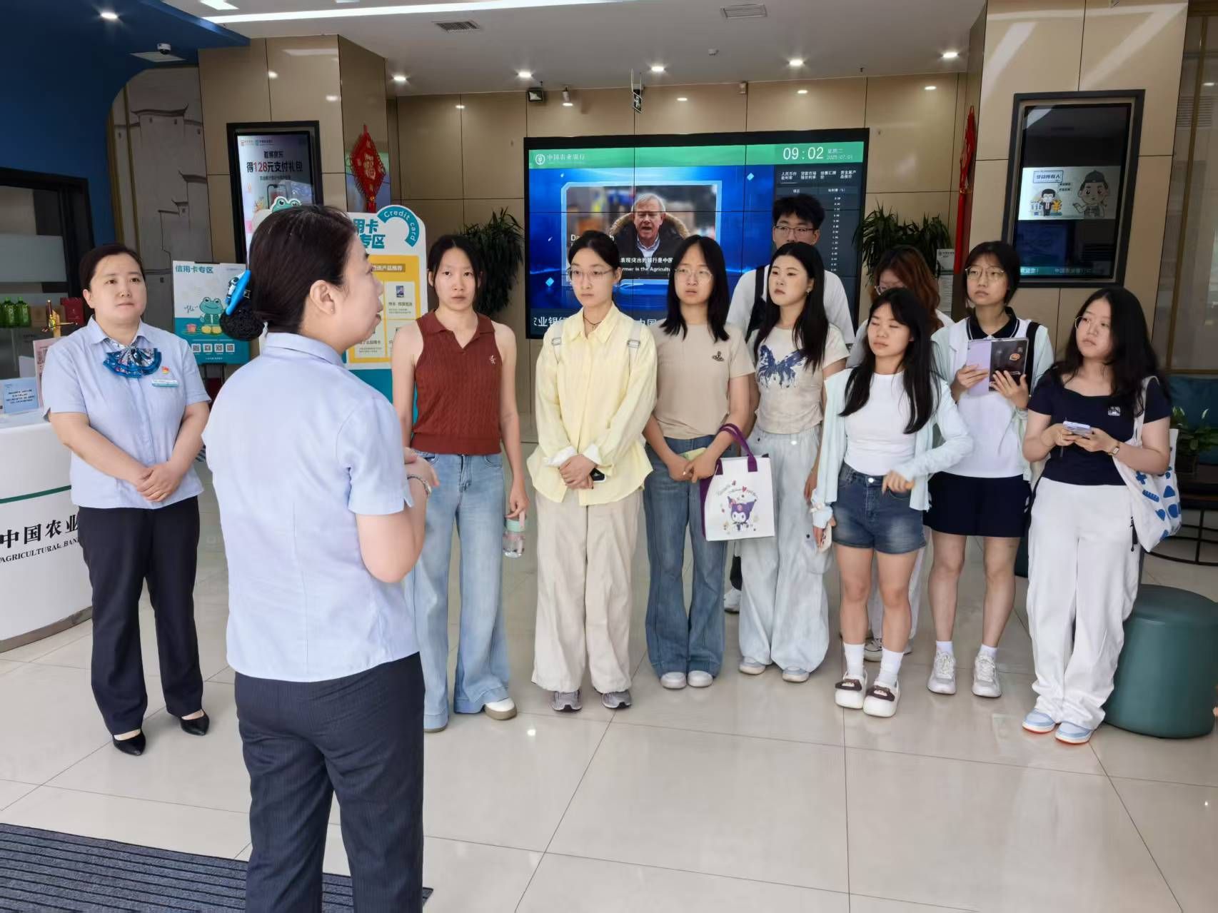 在柳南支行,学生们在大堂经理的带领和讲解下,体验了踏入银行网点之后的动线设计,明确了银行的功能分区,尝试了银行的智能设备,参观了银行的货币展厅,并对网点周围的环境布局、同业机构分布情况进行了实地考察。同学们纷纷感叹,现在的银行网点布置太“人性化”了,进门有大堂经理热情地引导,等待区有舒适的沙发、图书、免费的茶水和咖啡,针对老年人还配备了老花镜、血压仪等适老设施,在等待期间客户还可以到展厅参观和学习相关金融知识,真正做到了“一切以客户为中心”。即使是产品宣传,展板制作精美、内容清晰,再加上工作人员的讲解,很容易让客户明白产品的特色。智能设备的功能非常强大,大部分业务在大堂经理的指导下都可以自助完成,大大提高了业务办理的效率。在这个网点周围还分布有工行、交行、建行、浦发等银行的网点,同业竞争非常激烈,同学们也深深理解了银行工作的不易。