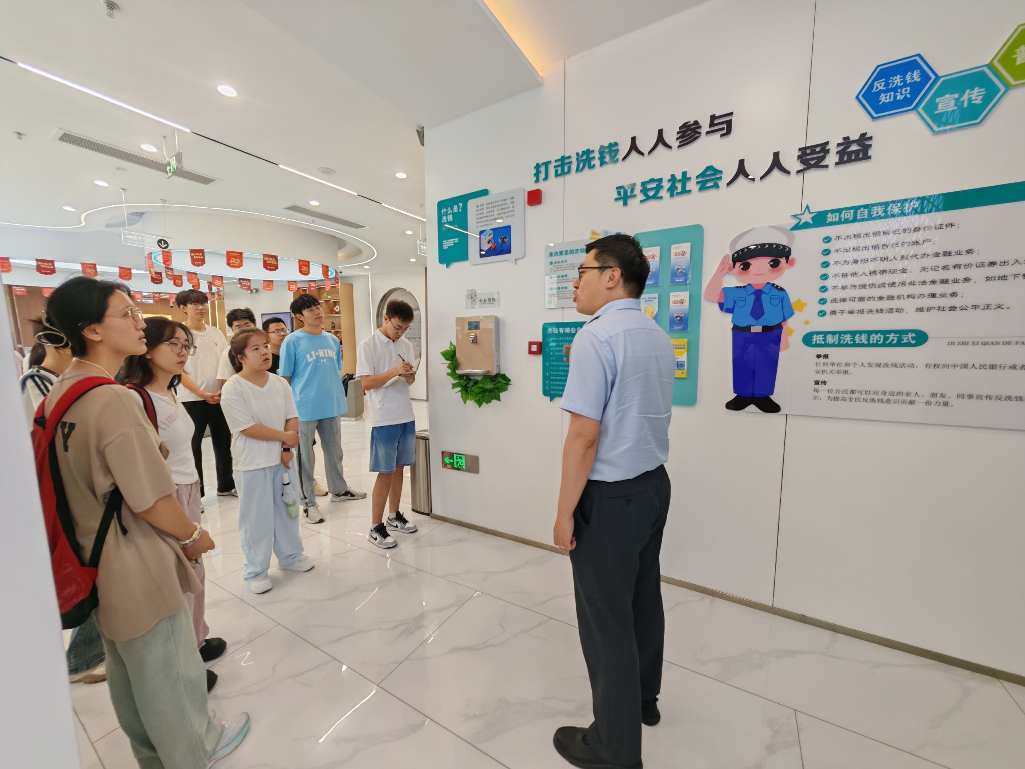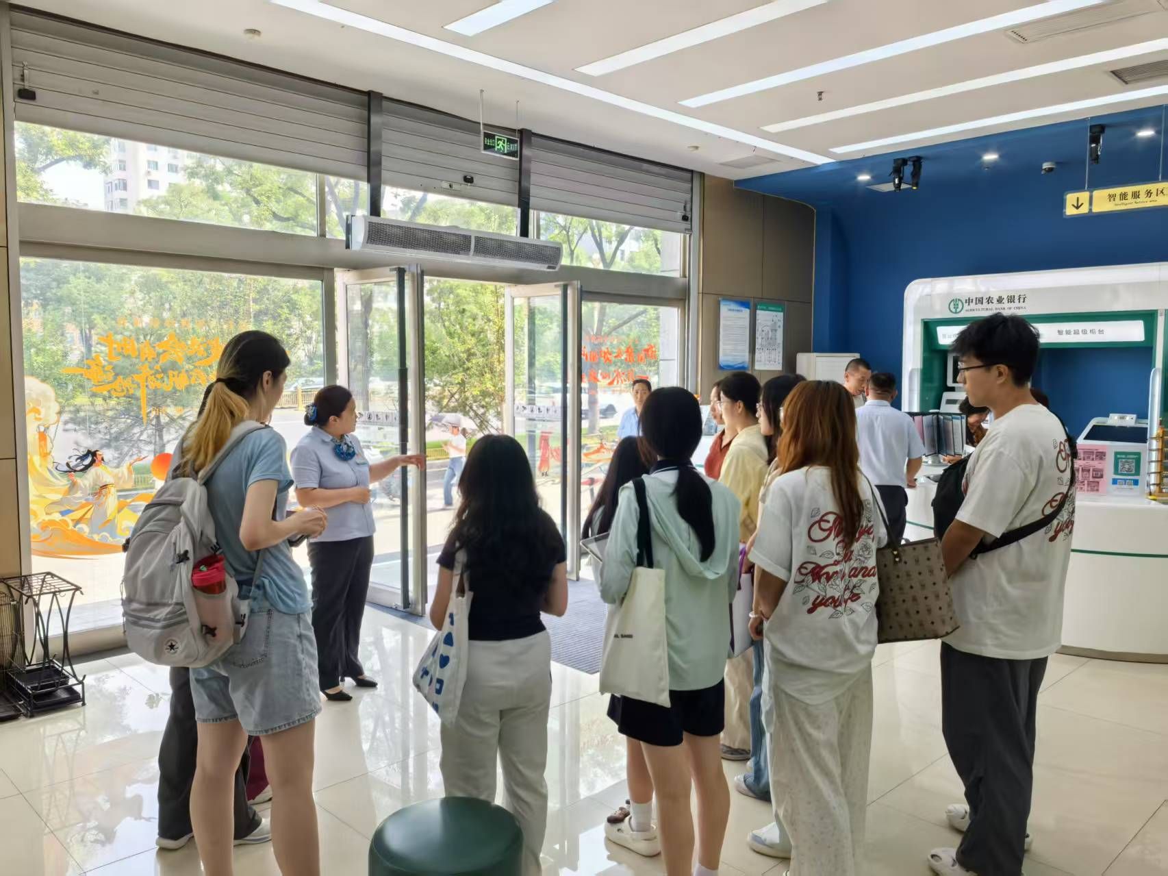 综改分行位于太原市综改区,是为更好地服务山西经济转型发展新设的机构,无论是网点布局还是设施设备都更加“高大上”,宽敞的大厅里各种自助设备整齐排列,每一个功能区都有一个独立的小空间,便于客户坐下来慢慢办理业务,体验感更好。工作人员均为清一色的年轻人,热情而富有活力,讲解清晰、重点突出,尤其是对反洗钱和防电信诈骗的政策和形势解读,增强了同学们的防范意识,提高了对金融安全重要性的认识。