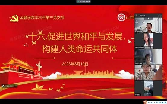 本科生第三党支部在8月12日进行了第十六章的学习,本讲的主要内容是“促进世界和平与发展,构建人类命运共同体”,由本科生第三党支部预备党员原红丹带领大家学习,本科生第三党支部邱马玥主持并总结发言。
