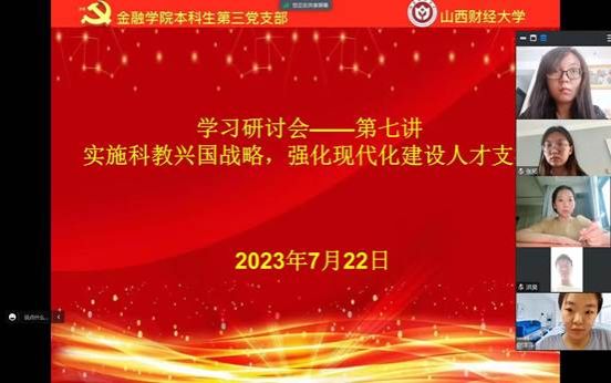 概要:继上次本科生第三党支部预备党员吕琪带领大家学习《推动经济高质量发展》后,在7月22日进行了第六章的学习,本章的主要内容是“实施科教兴国战略,强化现代化建设人才支撑”,本章由本科生第三党支部预备党员万泓滢带领大家学习,本科生第三党支部邱马玥主持并总结发言。