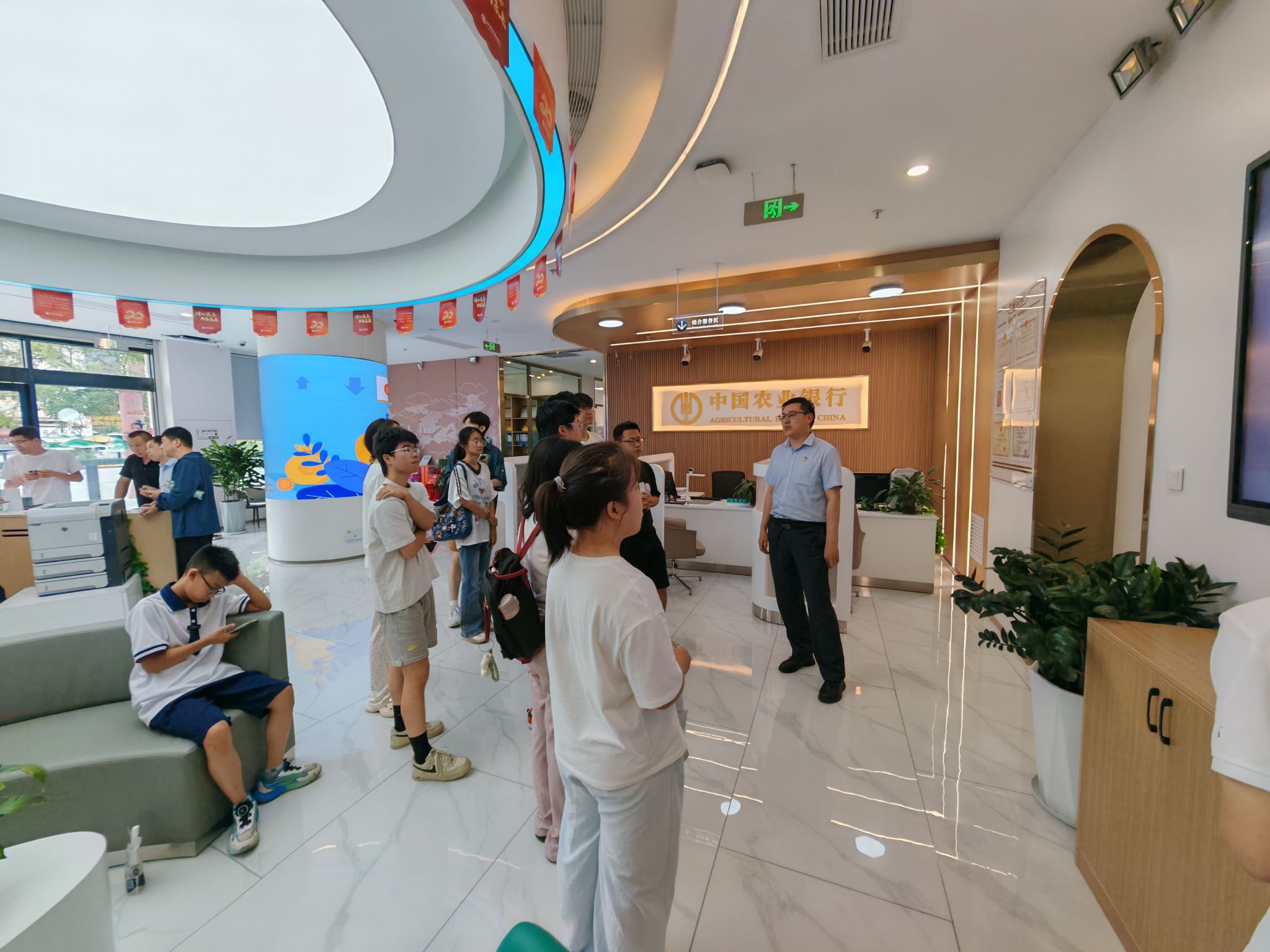 综改分行位于太原市综改区,是为更好地服务山西经济转型发展新设的机构,无论是网点布局还是设施设备都更加“高大上”,宽敞的大厅里各种自助设备整齐排列,每一个功能区都有一个独立的小空间,便于客户坐下来慢慢办理业务,体验感更好。工作人员均为清一色的年轻人,热情而富有活力,讲解清晰、重点突出,尤其是对反洗钱和防电信诈骗的政策和形势解读,增强了同学们的防范意识,提高了对金融安全重要性的认识。