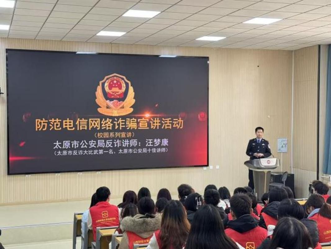 修德202阶教进行,现场座无虚席,先是由太原市公安局反诈十佳讲师结合近期高发诈骗案例,用真实、鲜活的素材为同学们深入剖析校园电信诈骗、网络刷单诈骗、虚假征信诈骗等常见套路,通过案例解析、现场问答等互动形式,细致讲解防范要点与应对方法,切实提升学生的反诈识别能力,引导学生增强警惕性,掌握自我保护技能。随后,民生银行金牌消保讲师以“从不被骗”到“会理财”为切入点,聚焦青年消费特点与金融需求,引导同学们树立理性消费观念、正确使用金融产品、维护个人征信安全,帮助青年群体树立健康向上的消费观与理财观,做到防诈有术、理财有方。同学们在轻松热烈的氛围中进一步夯实了金融基础知识储备,提升了风险识别与应对能力。