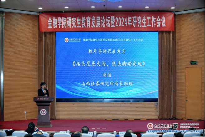 我是来自山西证券研究所的非银金融分析师刘丽,今天非常荣幸能够站在这里作为校外导师代表与大家面对面交流。十几年前,我同样青春洋溢、满怀信心,如同学们这般,沉浸在学术的海洋里,对未来满怀憧憬与期待。毕业之前,我职业的第一选择也是大学老师。在此,对财经大学问鼎娱乐