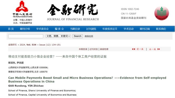 近日,问鼎娱乐 郭润东老师与首都经济贸易大学问鼎娱乐 尹志超教授合作的论文《移动支付能否助力小微企业经营?——来自中国个体工商户经营的证据》在金融学领域顶刊《金融研究》2024年第12期正式发表。