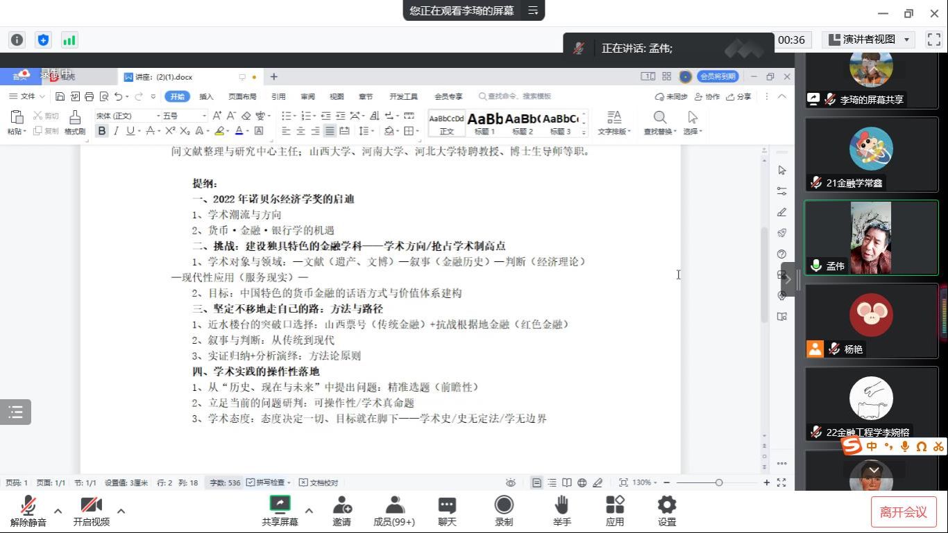 会议伊始,孟伟教授分享了他对2022年诺贝尔经济学奖的看法,孟教授认为此次诺贝尔经济学奖颁给了探究银行领域的先锋,这将引领学术潮流与方向,为货币学、金融学、银行学这三门学科的发展创造了机遇,同时也带来了新的挑战,如何建设独具特色的金融学科,以抢占学术制高点。孟教授站在货币金融史的角度,为山西发展提供了方法与路径:传统金融与红色金融共同发展。最后孟教授为与会者们提供了新的研究思路和方法,希望广大师生可以抓住这次机遇,助力山西发展。